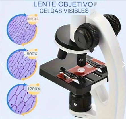 • 🔹 Aumento ajustable: objetivos intercambiables de 100X, 400X y 1200X para observar desde diferentes perspectivas.